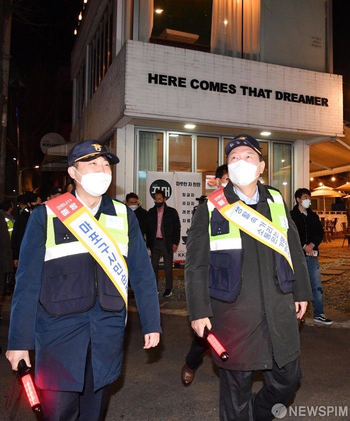[서울=뉴스핌] 국회사진취재단 = 윤석열 국민의힘 대선후보와 이준석 당대표가 7일 밤 마포구 합정동 홍익자율방범대를 찾아 방범대원들과 주택가와 상가들을 돌며 방범활동을 하고 있다. 2021.12.07 photo@newspim.com