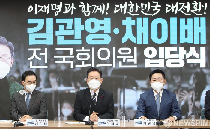 [서울=뉴스핌] 이형석 기자 = 이재명 더불어민주당 대선 후보가 10일 오전 서울 여의도 당사에서 열린 김관영·채이배 전 국회의원 입당식에 참석해 인사말을 하고 있다. 2021.12.10 leehs@newspim.com