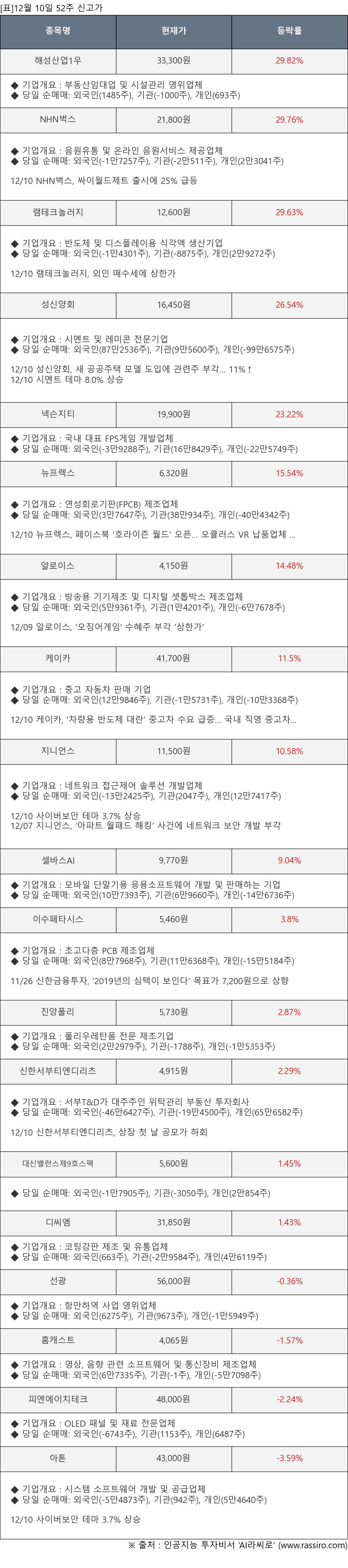 ※ 관련 종목: 해성산업1우, NHN벅스, 램테크놀러지, 성신양회, 넥슨지티, 뉴프렉스, 알로이스, 케이카, 지니언스, 셀바스AI, 이수페타시스, 진양폴리, 신한서부티엔디리츠, 대신밸런스제9호스팩, 디씨엠, 선광, 홈캐스트, 피엔에이치테크, 아톤