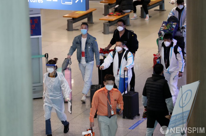 | [영종도=뉴스핌] 정일구 기자 = 신종 코로나바이러스 감염증(코로나19) 변이 바이러스인 '오미크론'의 국내 유입으로 확산 우려가 커지고 있는 가운데 3일 오후 인천국제공항 제1여객터미널을 통해 입국한 해외 입국자들이 방역 관계자의 안내를 받으며 이동하고 있다. 정부는 변이 바이러스 국내 확산을 막기 위해 이날부터 16일까지 2주간 내국인 포함 모든 해외 입국자를 대상으로 예방접종 여부와 관계없이 10일간 격리조치를 시행한다. 2021.12.03 mironj19@newspim.com |