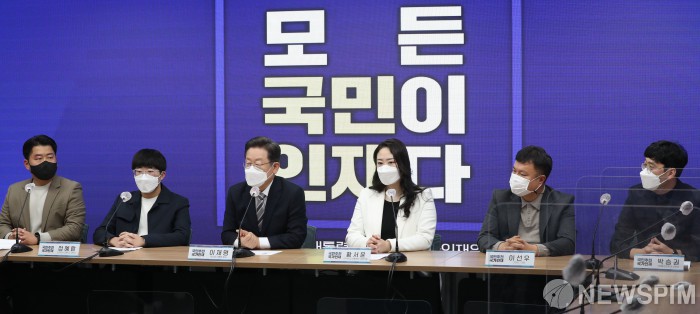 [서울=뉴스핌] 이형석 기자 = 이재명 더불어민주당 대선 후보가 16일 서울 여의도 중앙당사에서 열린 2차 국가인재 영입발표에서 인사말을 하고 있다. 박성호 부산해동병원 간호사(왼쪽부터), 정예람 인천만수고 3학년, 이후보, 황서윤 박피디와황배우 공동대표, 이선우 그린테그 대표, 박승권 직업환경의학과 전문의. 2021.12.16 leehs@newspim.com