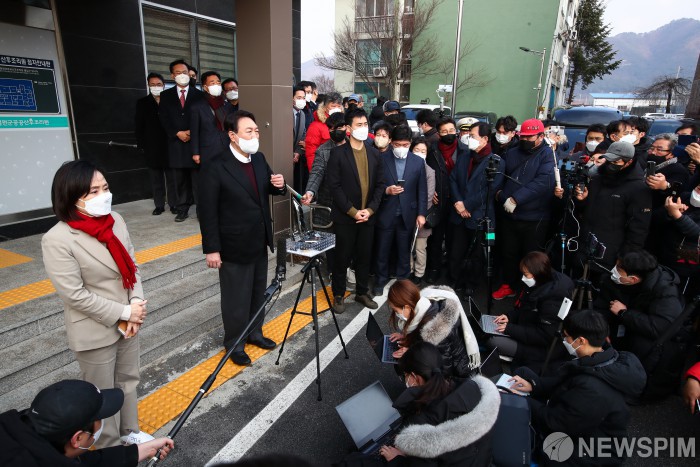 [철원=뉴스핌] 국회사진취재단 = 국민의힘 윤석열 대선 후보가 20일 철원군 갈말읍 공공 산후조리원을 방문해 둘러본 뒤 취재진의 질문에 답변하고 있다. 2021.12.20 photo@newspim.com