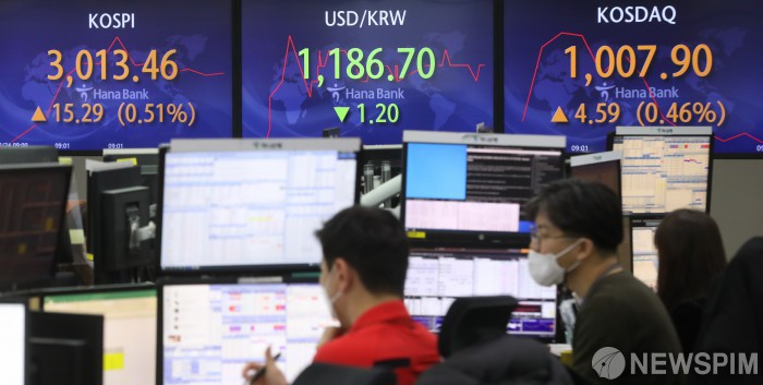 [서울=뉴스핌] 김민지 인턴기자 = 코스피가 전 거래일(2998.17)보다 11.31포인트(0.38%) 오른 3009.48에 시작한 24일 오전 서울 중구 하나은행 딜링룸에 지수가 표시돼있다. 이날 코스닥 지수는 전 거래일(1003.31)보다 4.74포인트(0.47%) 오른 1008.05에, 원·달러 환율은 전 거래일(1187.9)보다 1.7원 내린 1186.2원에 거래를 시작했다. 2021.12.24 kimkim@newspim.com