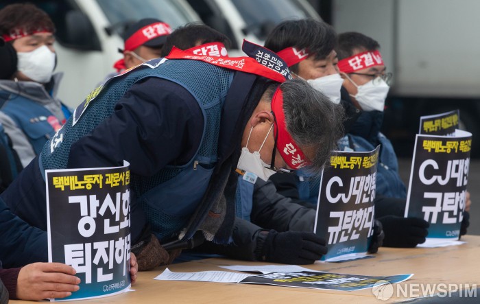 [경기광주=뉴스핌] 윤창빈 기자 = 진경호 민주노총 서비스연맹 전국택배노동조합 위원장이 28일 오전 경기 광주시 CJ대한통운 성남터미널에서 열린 전국택배노조 CJ대한통운 총파업 돌입 기자회견에서 파업으로 인한 택배 배송 차질에 대해 사과를 하고 있다. 2021.12.28 pangbin@newspim.com