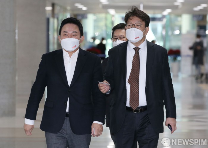 [서울=뉴스핌] 이형석 기자 = 권성동 국민의힘 사무총장과 원희룡 정책총괄본부장이 30일 오전 서울 여의도 국회 의원회관에서 열린 국민공감 정책 세미나에 입장하고 있다. 2021.12.30 leehs@newspim.com