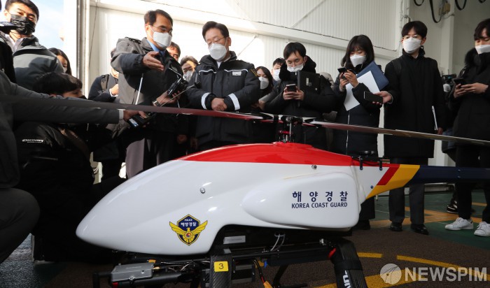 [인천=뉴스핌] 국회사진취재단 = 이재명 더불어민주당 대선후보가 30일 인천 중구 서해5도 특별경비단을 찾아 무인헬기를 살펴보고 있다. 2021.12.30 photo@newspim.com