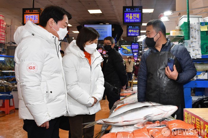 [서울=뉴스핌] 김학선 기자 = 안철수 국민의당 대선 후보와 부인 김미경 서울대 교수가 1일 새해를 맞아 서울 노량진수산시장을 방문, 상인과 대화하고 있다. 2022.01.01 yooksa@newspim.com