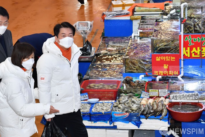 [서울=뉴스핌] 김학선 기자 = 안철수 국민의당 대선 후보와 부인 김미경 서울대 교수가 1일 새해를 맞아 서울 노량진수산시장을 방문, 장을 보고 있다. 2022.01.01 yooksa@newspim.com