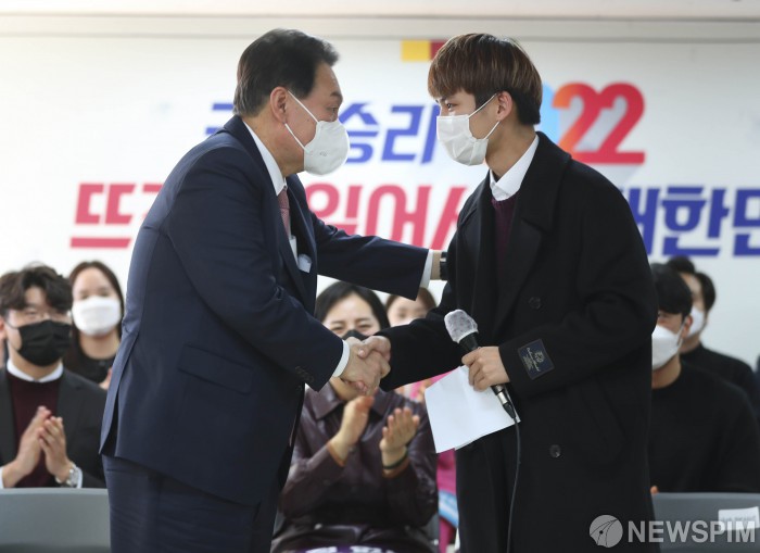 [서울=뉴스핌] 김학선 기자 = 윤석열 국민의힘 대선 후보가 1일 서울 여의도 대하빌딩에서 열린 국민의힘 선대위 신년인사회에 참석해 젠더 관련 발언을 마친 곽승용 청년보좌역을 격려하고 있다. 2022.01.01 yooksa@newspim.com