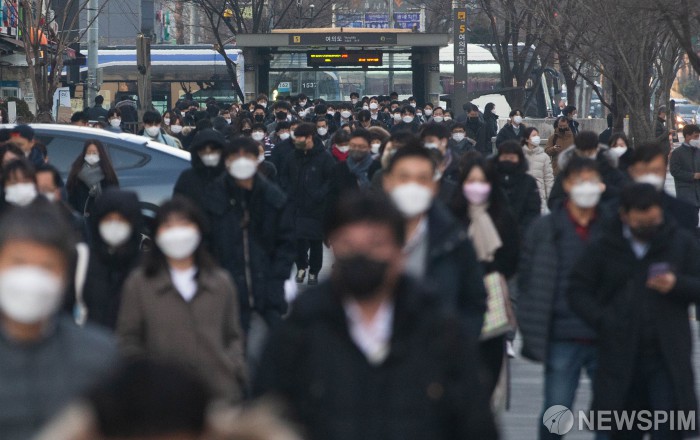 [서울=뉴스핌] 윤창빈 기자 =2022년 임인년 새해 첫 출근이 시작된 3일 오전 서울 여의도역의 시민들이 출근길을 서두르고 있다. 2021.01.03 pangbin@newspim.com