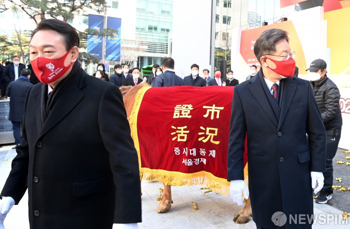 [서울=뉴스핌] 국회사진취재단 = 윤석열 국민의힘 대선 후보와 이재명 더불어민주당 대선 후보가 3일 서울 여의도 한국거래소 본관 앞에서 열린 '2022 증시대동제'에서 악수를 한 뒤 행사장을 나서고 있다. 2022.01.03 photo@newspim.com