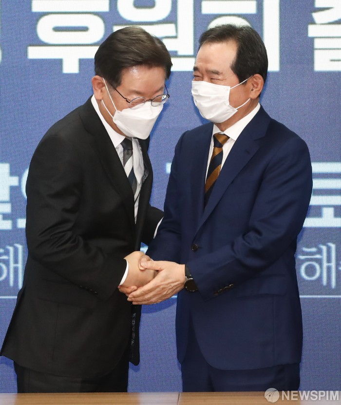 [서울=뉴스핌] 최상수 기자 = 더불어민주당 이재명 대선 후보(왼쪽)와 정세균 이재명후원회 후원회장(오른쪽)이 4일 서울 여의도 중앙당사에서 열린 더불어민주당 대통령선거 후보자 이재명 후원회 출범식이 끝난 뒤 악수하고 있다. 2022.01.04 kilroy023@newspim.com