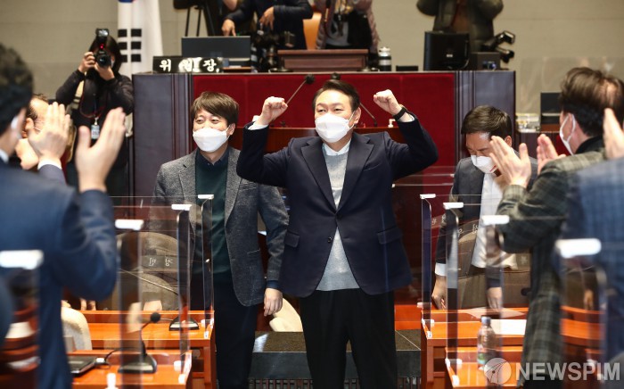 [서울=뉴스핌] 최상수 기자 = 국민의힘 윤석열 대선 후보가 6일 국회에서 열린 의원총회에서 의원들의 환호에 손을 들어보이고 있다. 왼쪽은 이준석 대표. 2022.01.06 kilroy023@newspim.com