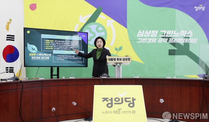[서울=뉴스핌] 최상수 기자 = 심상정 정의당 대선 후보가 10일 오전 서울 여의도 국회에서 '그린노믹스 그린경제 공약'을 발표하고 있다. 2022.01.10 kilroy023@newspim.com