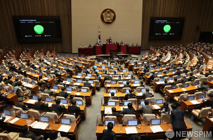 [서울=뉴스핌] 최상수 기자 = 11일 오후 서울 여의도 국회에서 열린 새해 첫 본회의에서 건축물관리법 일부개정법률안이 통과되고 있다. 2022.01.11 kilroy023@newspim.com