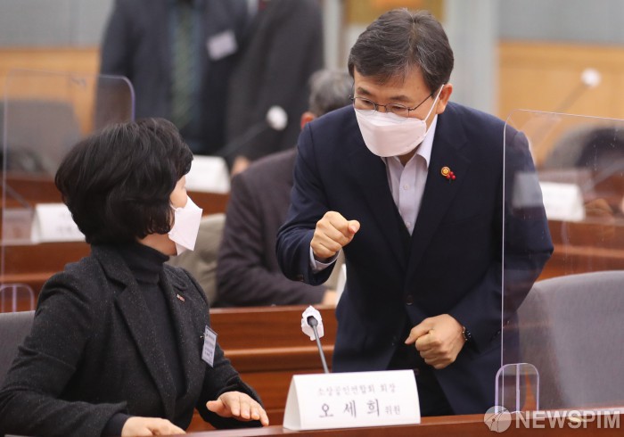 [서울=뉴스핌] 김학선 기자 = 권덕철 보건복지부 장관과 오세희 소상공인연합회장이 12일 서울 종로구 정부서울청사 별관에서 열린 코로나19 일상회복지원위원회에서 인사를 나누고 있다. 2022.01.12 yooksa@newspim.com