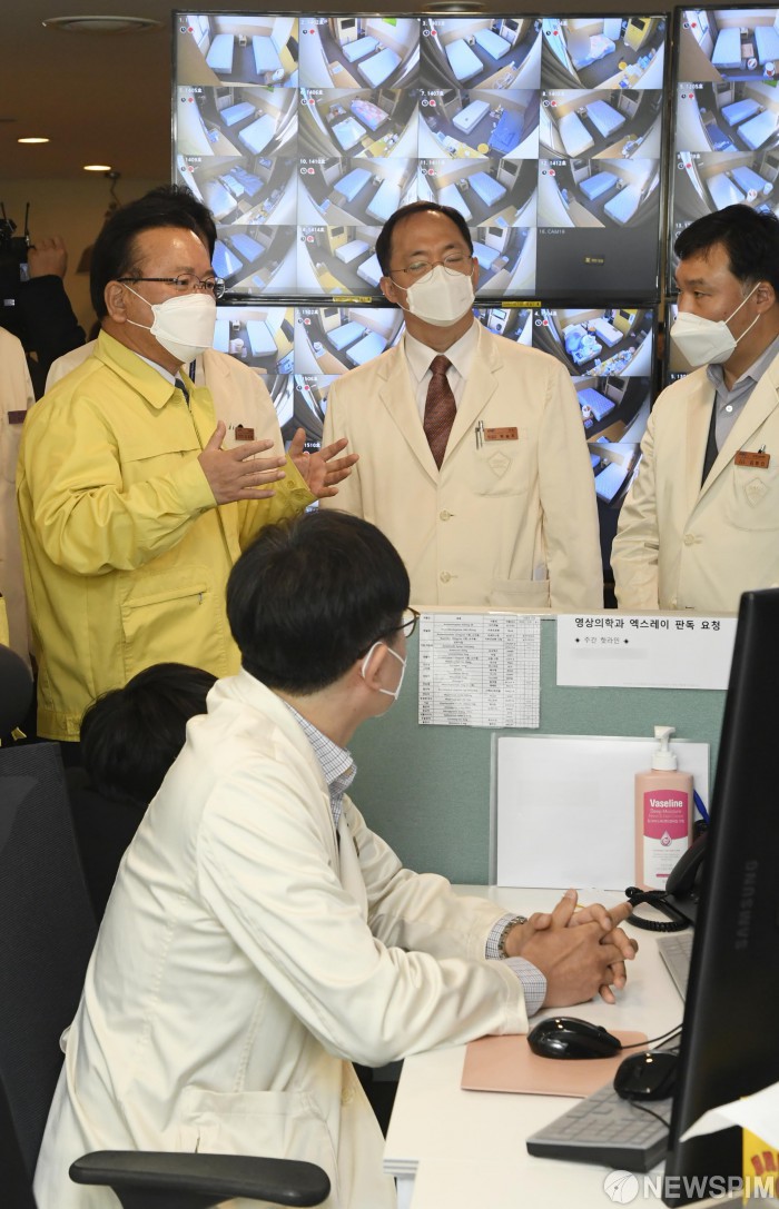 [서울=뉴스핌] 김학선 기자 = 김부겸 국무총리가 17일 코로나19 먹는 치료제 관련 점검 등을 위해 서울 중구 동호생활치료센터를 방문해 의료진과 대화를 나누고 있다. 2022.01.17 yooksa@newspim.com