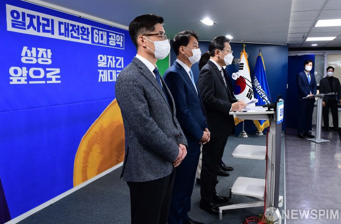 [서울=뉴스핌] 이형석 기자 = 이재명 더불어민주당 대선후보가 18일 서울 여의도 민주당사에서 일자리 대전환 6대 공약을 발표하고 있다. 2022.01.18 leehs@newspim.com