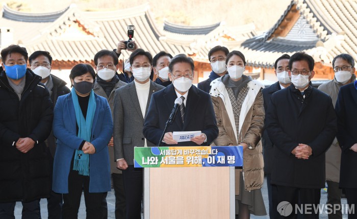 [서울=뉴스핌] 국회사진취재단 = 더불어민주당 이재명 대선후보가 21일 오후 서울 은평구 은평한옥마을 찾아 서울을 글로벌 경제·문화 수도로 육성하기 위한 서울 지역 공약을 발표하고 있다. 2022.01.21 photo@newspim.com