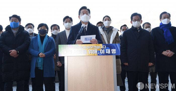 [서울=뉴스핌] 국회사진취재단 = 더불어민주당 이재명 대선후보가 21일 오후 서울 은평구 은평한옥마을 찾아 서울을 글로벌 경제·문화 수도로 육성하기 위한 서울 지역 공약을 발표하고 있다. 2022.01.21 photo@newspim.com