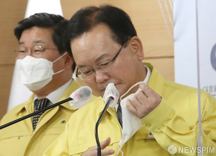 [서울=뉴스핌] 김학선 기자 = 김부겸 국무총리가 24일 서울 종로구 정부서울청사에서 코로나19 방역 관련 대국민 담화 발표에 앞서 마스크를 벗고 있다. 2022.01.24 yooksa@newspim.com