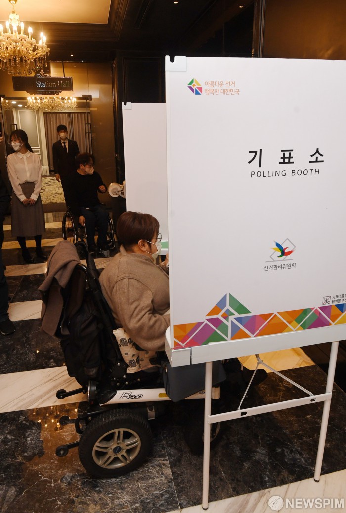 [서울=뉴스핌] 이형석 기자 = 중앙선거관리위원회 주최로 26일 오후 서울 여의도 켄싱턴 호텔에서 열린 2022년 양대선거 장애인유권자 참정권 보장을 위한 정책간담회에서 참석자들이 모의투표 체험을 하고 있다. 2022.01.26 leehs@newspim.com