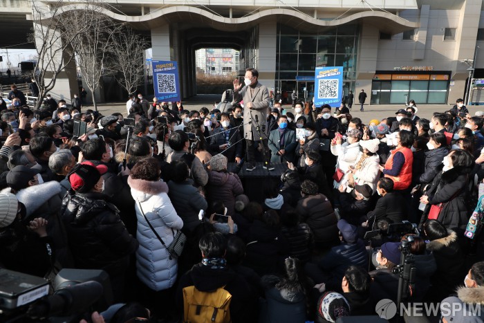 [파주=뉴스핌] 국회사진취재단 = 이재명 더불어민주당 대선 후보가 26일 오후 경기도 파주시 금촌역 광장에서 열린 거리연설에서 시민들에게 지지를 호소하고 있다. 2022.01.26 photo@newspim.com