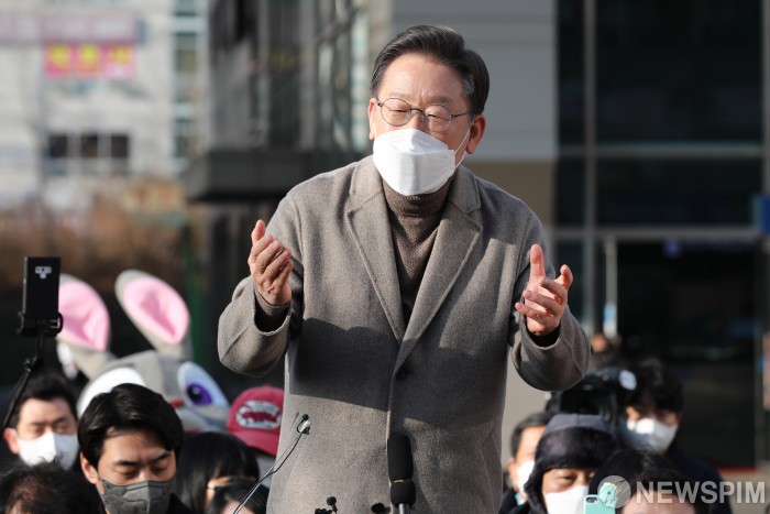 [파주=뉴스핌] 국회사진취재단 = 이재명 더불어민주당 대선 후보가 26일 오후 경기도 파주시 금촌역 광장에서 열린 거리연설에서 시민들에게 지지를 호소하고 있다. 2022.01.26 photo@newspim.com
