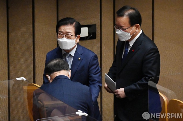 [서울=뉴스핌] 최상수 기자 = 27일 서울 여의도 국회에서 열린 임시국회 본회의에서 박병석 의장이 홍남기 부총리 겸 기획재정부 장관과 인사하고 있다. 오른쪽은 김부겸 국무총리. 2022.01.27 kilroy023@newspim.com