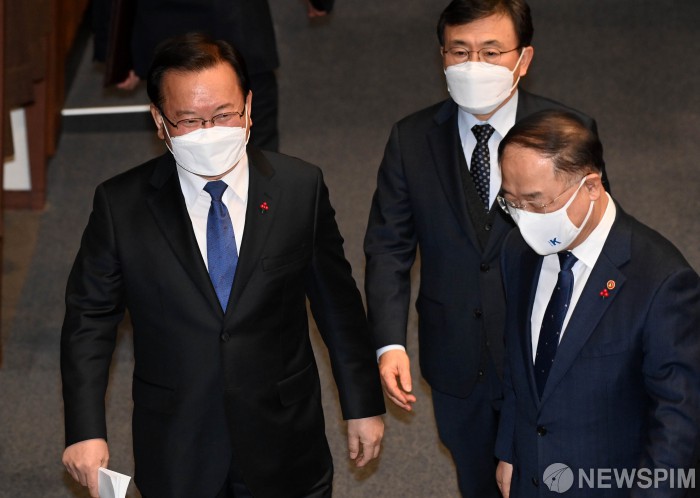 [서울=뉴스핌] 최상수 기자 = 27일 서울 여의도 국회에서 열린 임시국회 본회의에서 김부겸 총리가 추경 시정연설을 마친 후 본회의가 산회하자 문승욱 산업통상자원부 장관, 홍남기 부총리 겸 기획재정부 장관과 퇴장하고 있다. 2022.01.27 kilroy023@newspim.com