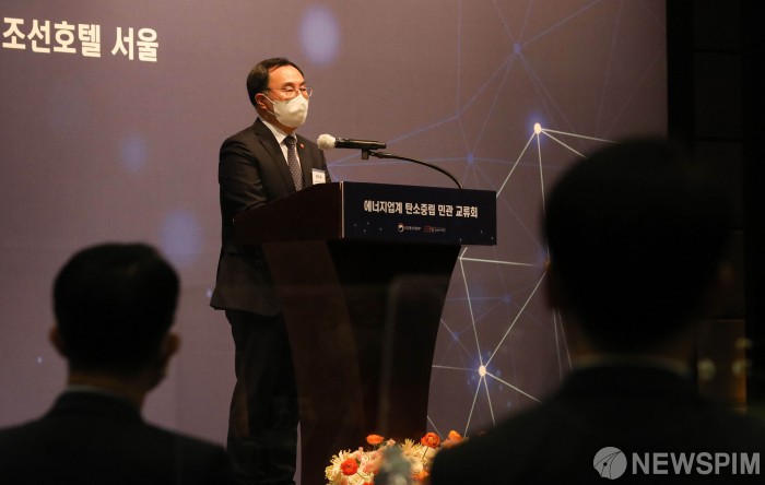 [서울=뉴스핌] 황준선 기자 = 문승욱 산업통상자원부 장관이 11일 오후 서울 중구 웨스틴조선호텔에서 열린 에너지업계 탄소중립 민·관 교류회에서 축사를 하고 있다. 2022.02.11 hwang@newspim.com