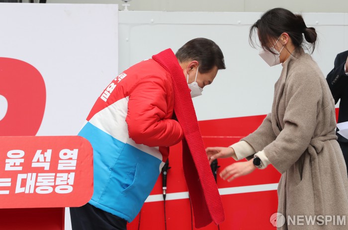 [서울=뉴스핌] 국회사진취재단 = 윤석열 국민의힘 대선 후보가 제20대 대통령 선거 공식 선거운동이 시작된 15일 오전 서울 중구 청계광장에서 열린 출정식에서 국회 인턴 이선아 씨에게 빨간목도리를 전달받고 있다. 2022.02.15 photo@newspim.com