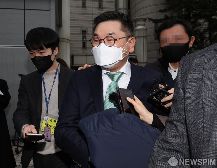 [서울=뉴스핌] 윤창빈 기자 = 주식 저가 매매를 통해 1300억원대 조세를 포탈한 혐의를 받고 있는 구본상 LIG그룹 회장이 15일 오후 서울 서초구 서울중앙지방법원에서 열린 1심 선고 공판을 마치고 법원을 나서고 있다. 이날 구본상 LIG그룹 회장은 1심에서 무죄를 선고받았다. 2022.02.15 pangbin@newspim.com