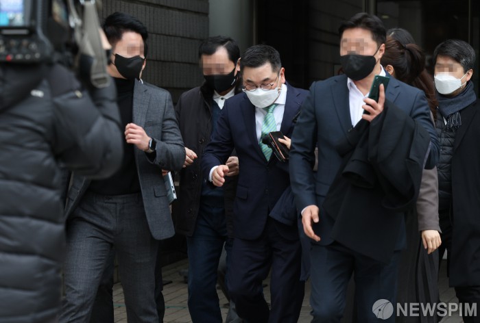 [서울=뉴스핌] 윤창빈 기자 = 주식 저가 매매를 통해 1300억원대 조세를 포탈한 혐의를 받고 있는 구본상 LIG그룹 회장이 15일 오후 서울 서초구 서울중앙지방법원에서 열린 1심 선고 공판을 마치고 법원을 나서고 있다. 이날 구본상 LIG그룹 회장은 1심에서 무죄를 선고받았다. 2022.02.15 pangbin@newspim.com
