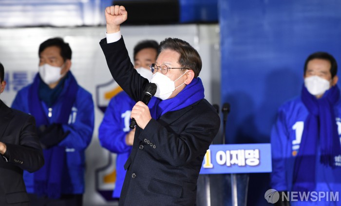 [서울=뉴스핌] 국회사진취재단 = 더불어민주당 이재명 대선후보가 제20대 대통령선거 공식선거기간 개시일인 15일 오후 서울 강남고속터미널 9호선 1번 출구에서 열린 선거유세에서 연설하며 지지를 호소하고 있다. 2022.02.15 photo@newspim.com