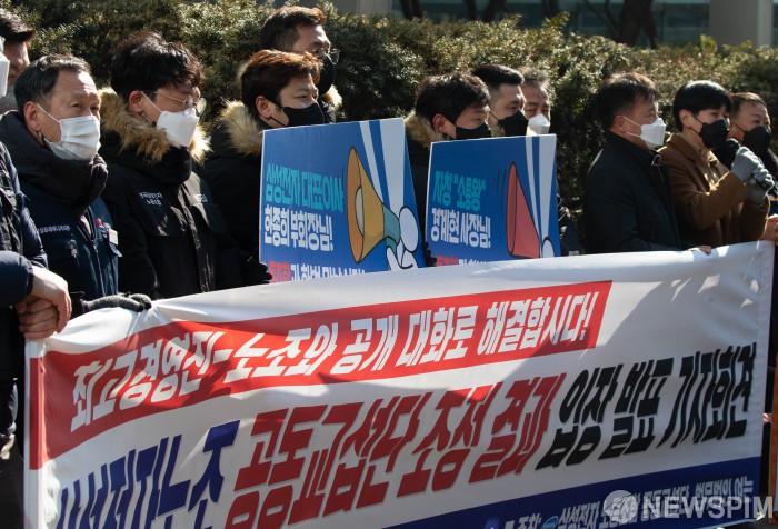 [서울=뉴스핌] 윤창빈 기자 = 삼성전자 노동조합 공동교섭단 조합원들이 16일 오전 서울 서초구 삼성전자 서초사옥 앞에서 열린 삼성전자노조 공동교섭단 조정 결과 입장 발표 기자회견에서 피켓을 들고 있다. 2022.02.16 pangbin@newspim.com