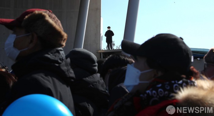 [수원=뉴스핌] 국회사진취재단 = 20일 경기도 수원 만석공원 제2야외음악당에서 열린 이재명 더불어민주당 대선후보의"검증된 실력과 성과, 대한민국을 위해 일하겠습니다!" 수원 유세에서 한 시민이 유세장이 잘 보이는 난간에 서서 경청하고 있다. 2022.02.20 photo@newspim.com