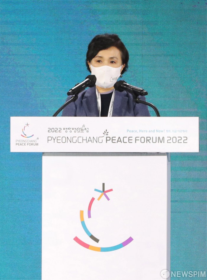 [평창=뉴스핌] 김학선 기자 = 강금실 강원문화재단 이사장(공동위원장)이 22일 강원도 평창군 알펜시아 컨벤션센터에서 강원도와 평창군, 한국국제협력단이 주최하고 2018평창기념재단 주관으로 열린 '2022 평창평화포럼'(PyeongChang Peace Forum 2022) 개회식에서 개회사를 하고 있다. 2022.02.22 yooksa@newspim.com