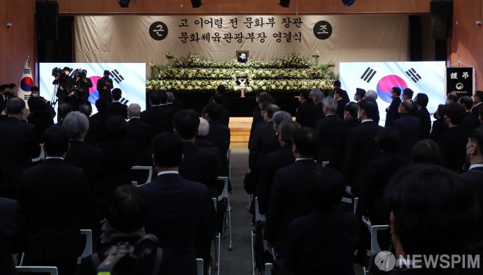 [서울=뉴스핌] 사진공동취재단 = 고 이어령 초대 문화부 장관의 영결식이 2일 서울 서초구 국립중앙도서관 국제회의장에서 문화체육관광부장으로 치러지고 있다. 2022.03.02 photo@newspim.com