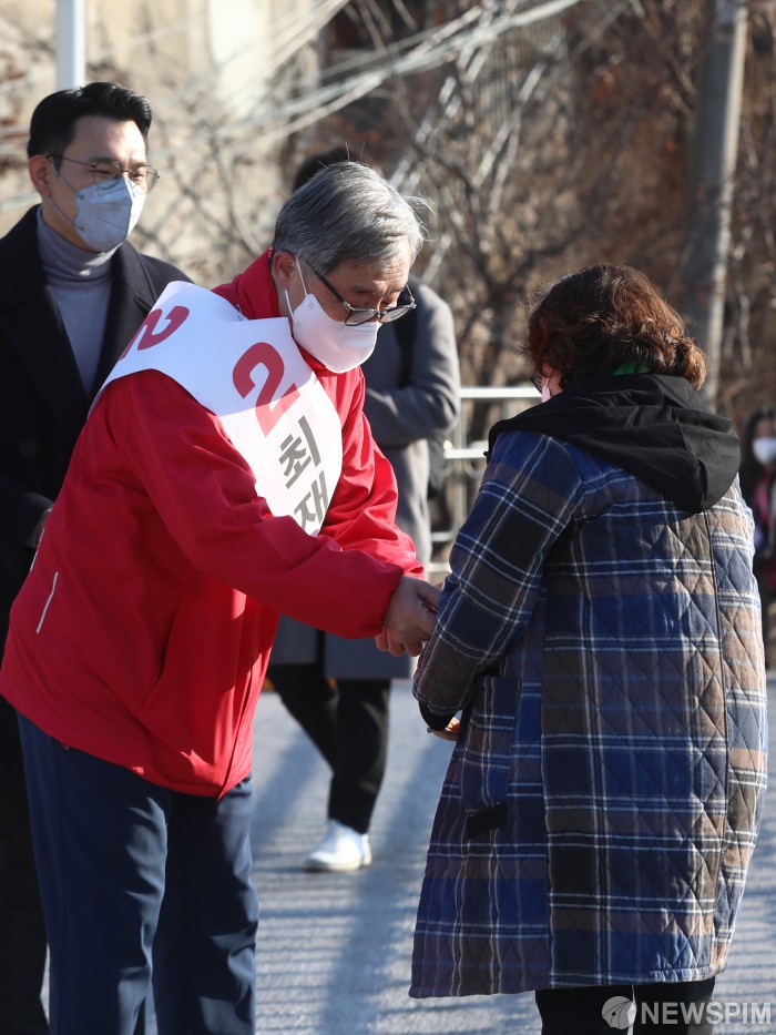 [서울=뉴스핌] 김민지 기자 = 서울 종로 보궐선거에 출마한 최재형 국민의힘 후보가 3일 오전 서울 종로구 세검정초등학교 인근에서 시민들에게 인사를 하고 있다. 2022.03.03 kimkim@newspim.com
