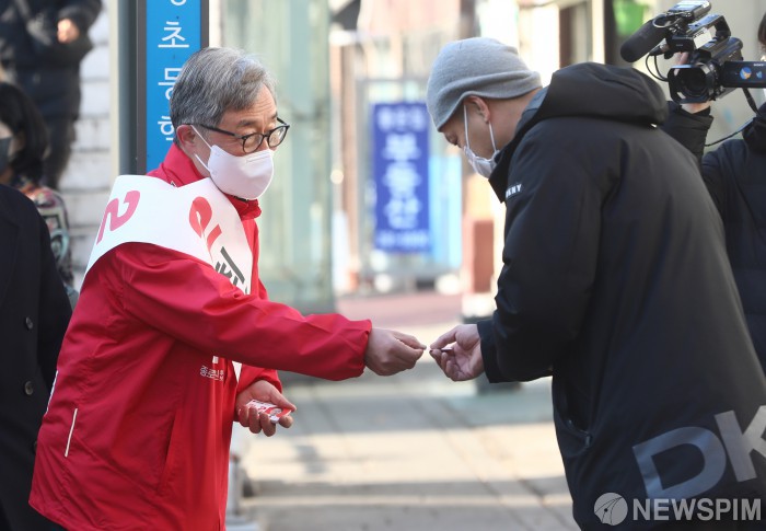 [서울=뉴스핌] 김민지 기자 = 서울 종로 보궐선거에 출마한 최재형 국민의힘 후보가 3일 오전 서울 종로구 세검정초등학교 인근에서 시민들에게 인사를 하고 있다. 2022.03.03 kimkim@newspim.com