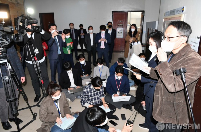 [서울=뉴스핌] 최상수 기자 = 박주민(오른쪽) 더불어민주당 의원과 전주혜 국민의힘 의원이 3일 서울 여의도 국회 법제사법위원장실에서 이재명 더불어민주당 대선 후보의 범죄수사경력 자료, 윤석열 국민의힘 대선 후보의 부동시 관련 자료를 열람한 뒤 취재진의 질문에 답하고 있다. 2022.03.03 kilroy023@newspim.com