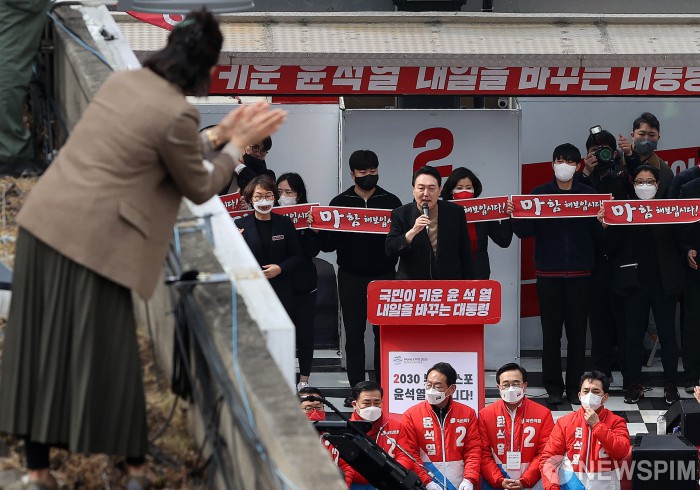 [부산=뉴스핌] 최상수 기자 = 윤석열 국민의힘 대선 후보가 4일 오전 부산 북구 구포시장 인근에서 열린 유세에서 지지를 호소하고 있다. 2022.03.04 kilroy023@newspim.com