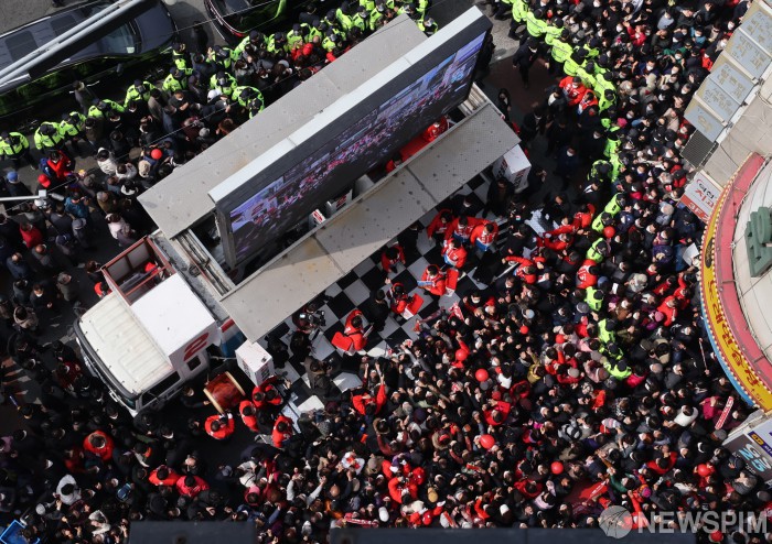[부산=뉴스핌] 최상수 기자 = 제20대 대통령선거 사전투표 첫날인 4일 오전 부산 북구 구포시장 인근에서 유권자들이 윤석열 국민의힘 대선 후보의 유세를 지켜보고 있다. 2022.03.04 kilroy023@newspim.com
