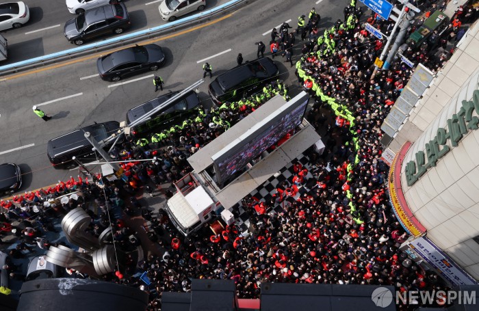 [부산=뉴스핌] 최상수 기자 = 제20대 대통령선거 사전투표 첫날인 4일 오전 부산 북구 구포시장 인근에서 윤석열 국민의힘 대선 후보의 지지자와 유권자들이 윤 후보의 유세를 지켜보고 있다. 2022.03.04 kilroy023@newspim.com