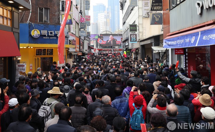 [부산=뉴스핌] 최상수 기자 = 제20대 대통령선거 사전투표 첫날인 4일 오전 부산 북구 구포시장 인근에서 유권자들이 윤석열 국민의힘 대선 후보의 유세를 지켜보고 있다. 2022.03.04 kilroy023@newspim.com