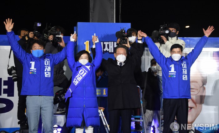유권자들의 환호에 답하는 이재명 대통령후보