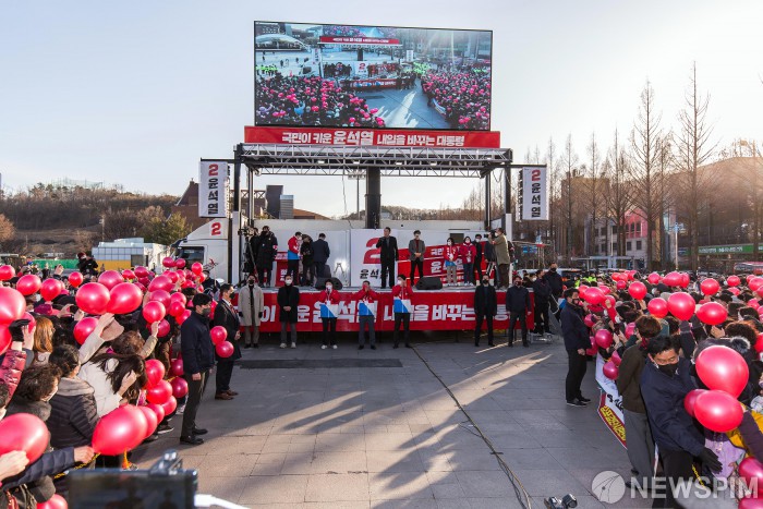 [김포=뉴스핌] 국회사진취재단 = 윤석열 국민의힘 대선 후보가 6일 오후 경기도 김포시 사우동 사우공원 시민회관 앞에서 열린 '젊은 도시 김포를 새롭게, 더 크게' 경기 김포 유세에서 시민들에게 지지를 호소하고 있다. 2022.03.06 photo@newspim.com