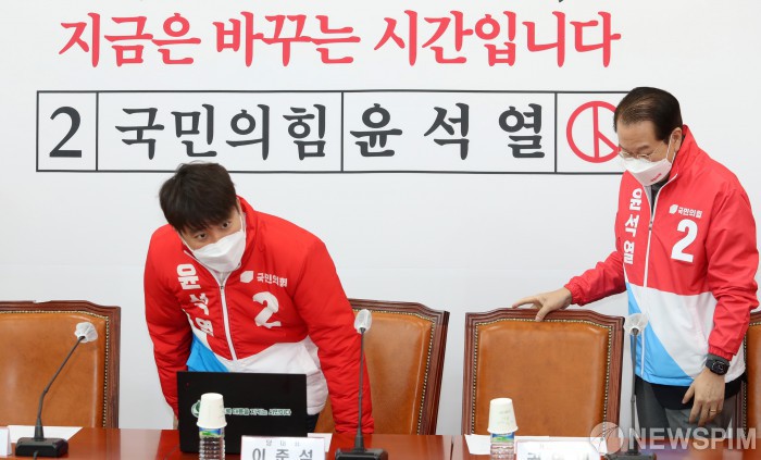[서울=뉴스핌] 최상수 기자 = 이준석 국민의힘 대표와 권영세 선거대책본부장이 7일 오전 국회에서 열린 확대선거대책본부회의에 참석하고 있다. 2022.03.07 kilroy023@newspim.com