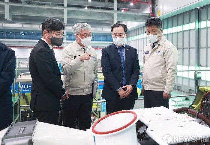 [서울=뉴스핌] 문승욱 산업통상자원부 장관이 16일 경남 사천시에 위치한 한국항공우주산업(KAI) 헬기 생산 현장을 방문해 안현호 사장으로부터 운영현황 및 애로사항을 청취한 후 수리온 헬기 생산·조립 현장을 둘러보고 있다.[사진=산업통상자원부] 2022.03.16 photo@newspim.com